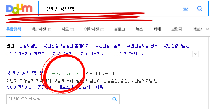 ① DAUM 포털을 열고, 검색창에 [국민건강보험]을 검색합니다. 그리고 상단에 나오는 홈페이지에 들어가면 됩니다.