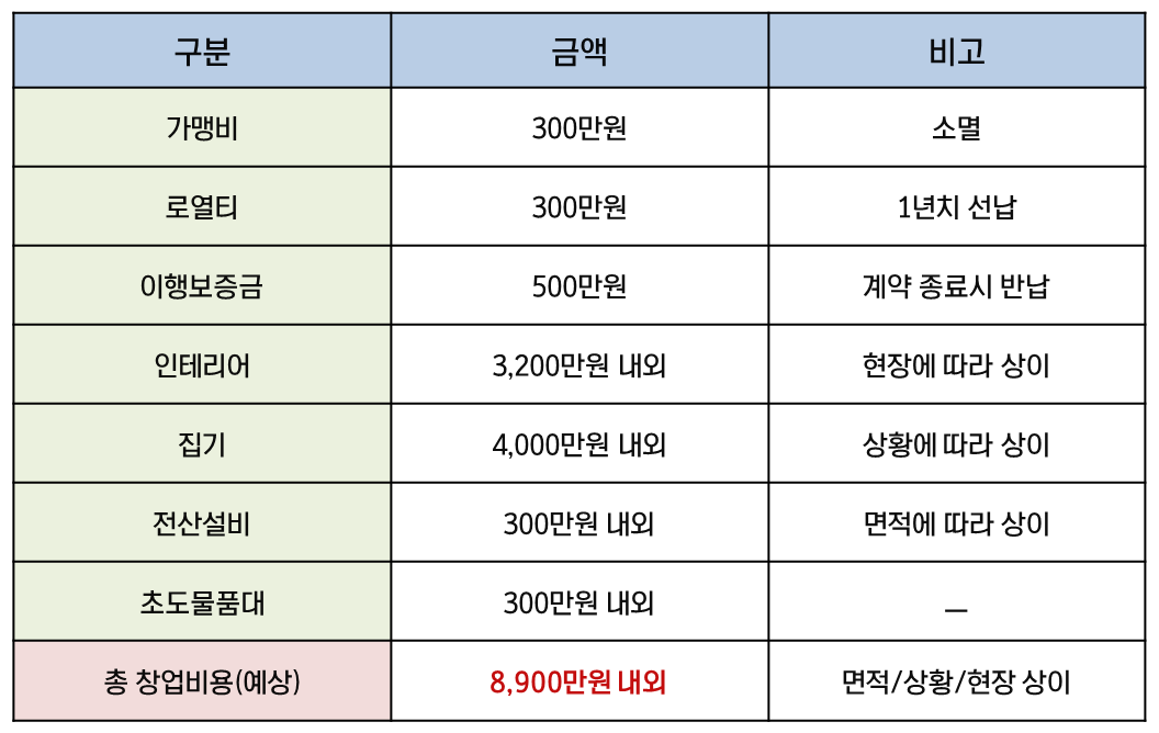 빽다방은 프랜차이즈 가맹개설액이 낮은 편에 속하기 때문에, 권리금과 보증금이 낮은 곳을 찾는다면 훨씬 저렴하게 창업이 가능하긴 합니다. 이를 감안했을 때, 창업비용은 최소 2억에서 3억원정도 든다고 생각하시면 됩니다.