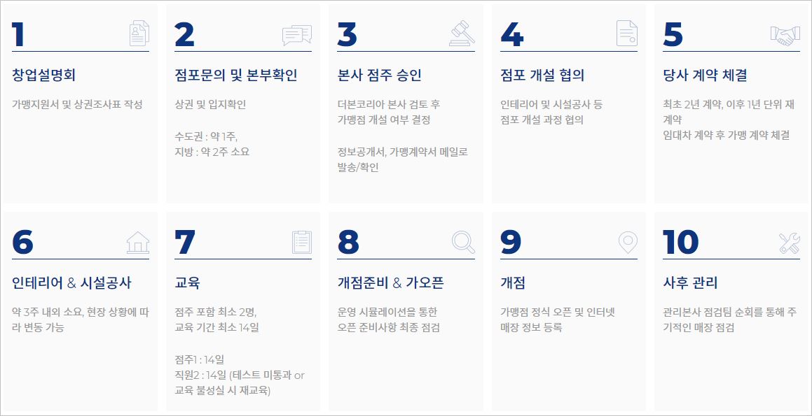 빽다방은 창업 요청 시, 가벼운 설명회를 듣고 입지를 결정하게 됩니다. 이후 계약을 체결하게 되면 인테리어, 시설공사, 교육 등이 이뤄지고 매장을 오픈하게 됩니다.