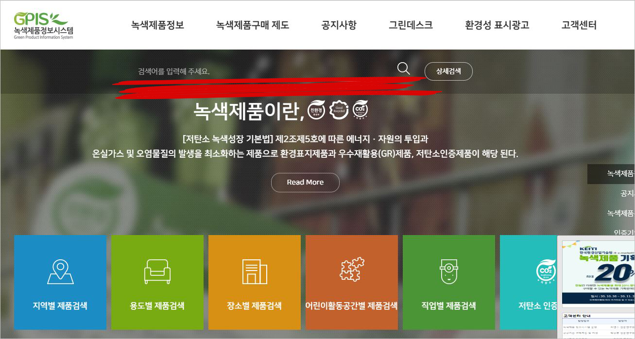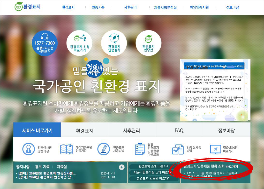 만약 잘 모르시겠다면 제품명으로 체킹할 수도 있습니다. 한국환경산업기술원(링크)에 들어가면 우측 하단에 '환경표지 인증제품 현황 조회'가 있습니다. 이를 선택하고 제품을 검색해보면 됩니다.