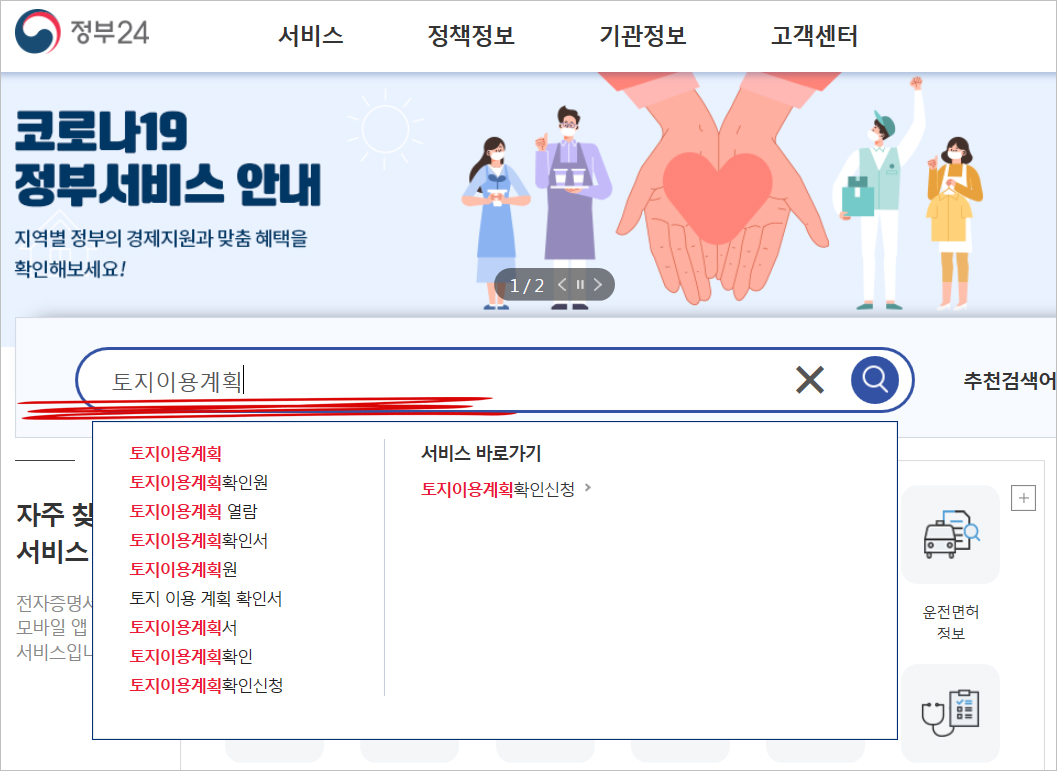 ② 메인페이지 중간에 있는 검색 창에 [토지이용계획]이라고 텍스팅하고 검색합니다.