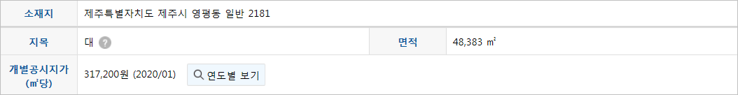 ④ 검색한 소재지는 지목이 대이며, 면적은 48,383㎡, 개별공시지가는 2001년 1월 기준, 317,200원으로 나왔습니다. 면적대비 계산해보면 총 지가금액은 150억대로 책정되네요.