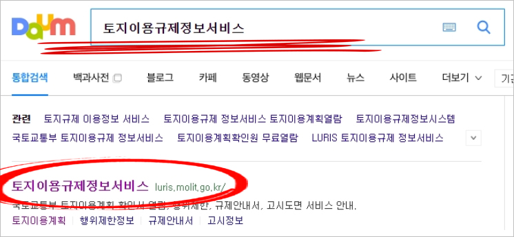 ① DAUM포털에서 [토지이용규제정보서비스]를 검색, 나오는 페이지에 들어갑니다. 이 홈페이지는 나라에서 운영하는 것으로 토지관련 상세 정보를 열람할 수 있습니다.