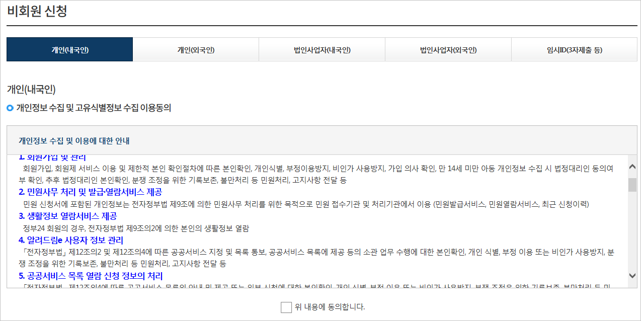 ④ 회원신청 또는 비회원신청 중 하나를 선택해야 합니다. 이 둘의 차이는 기존에 인쇄했었던 열람정보들의 내역을 볼 수 있고 없고의 차이입니다. 자주 들어오신다면 시간을 내어 회원가입을 하시고 아니시라면 비회원신청을 추천합니다.