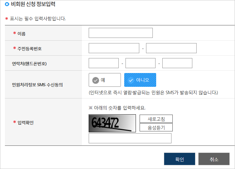 ⑤ 개인정보 수집관련 내용에 동의를 하고 비회원의 인적정보를 입력하여 줍니다. 이렇게 하면 모든게 완료됩니다.