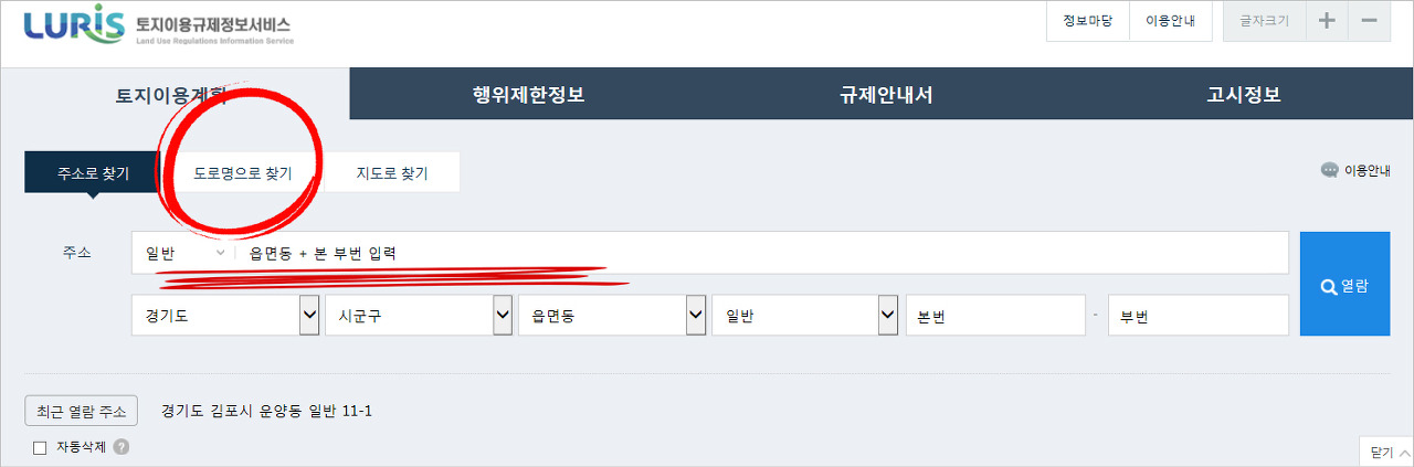 ② 입장하면 메인이 '토지이용계획'이므로 주소만 선택/입력하여 주면 됩니다. 저는 '도로명으로 찾기'가 가장 깔끔하여 이를 쓰는데, 편하신 방법을 사용하시면 됩니다.