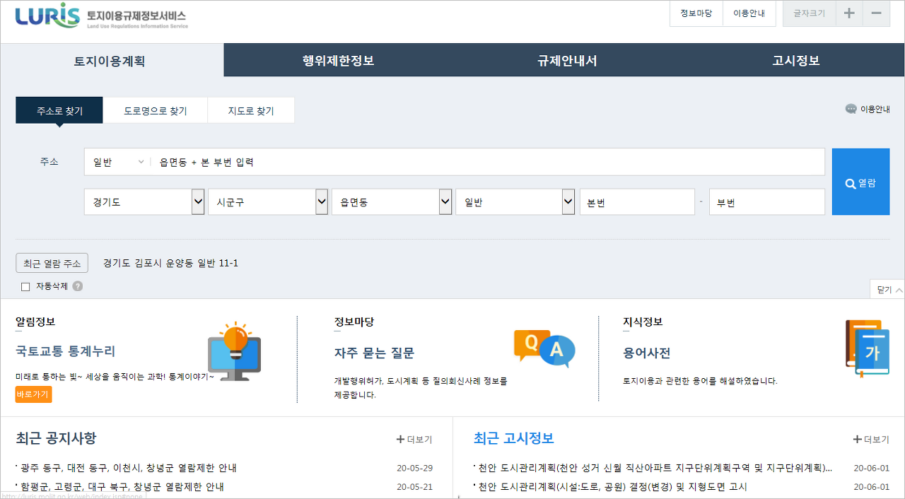 토지이용계획 확인원뿐만 아니라 고시정보와 금지행위 등까지 꼭 알아야 할 필수 정보들이 들어있기 때문에 매우 유용하게 활용하실 수 있는 사이트입니다.