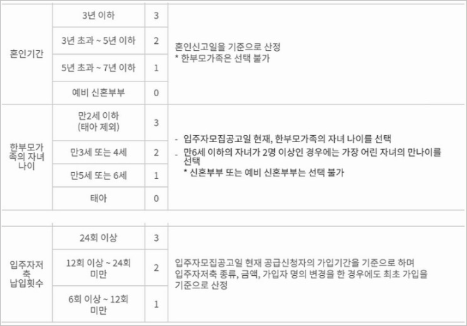 신혼부부 특공 내에서도 조건에 따라 순위 차이가 있습니다. 만약 미성년인 자녀가 있거나, 입양, 임신 자녀가 있을 경우 1순위에 해당하며, 이외에는 모두 2순위 입니다. (위 배점표로 점수를 참고해주세요)