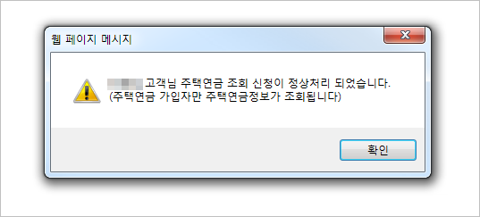 ⑤ 인증서 로그인이 완료되면, 메시지 창이 뜹니다. 이는 쉽게말해 국민연금을 보려면, 주택연금과 퇴직연금의 정보가 합산되어야 하므로 신청하고 3일 정도를 기다려야 한다는 것입니다.