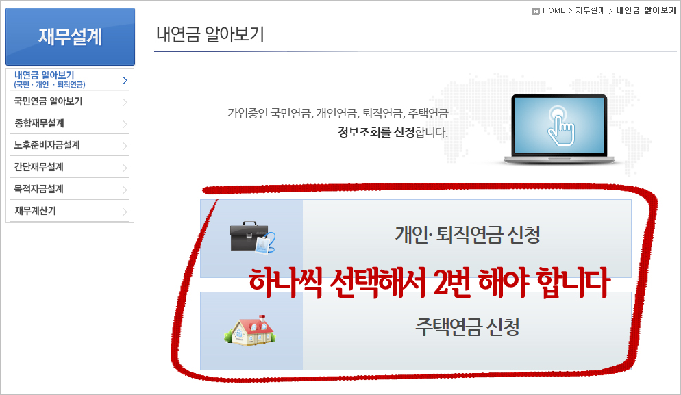 ⑦ 국민연금은 모든 금액을 합산하여 체킹해야 하기 때문에, '개인/퇴직연금 신청'. '주택연금 신청' 모두 한번씩 선택해주어야 합니다. 그래야 총 금액이 합산된 정확한 금액을 알 수 있습니다.