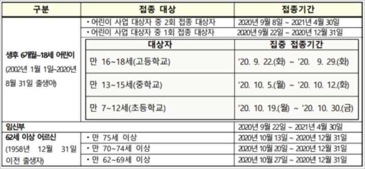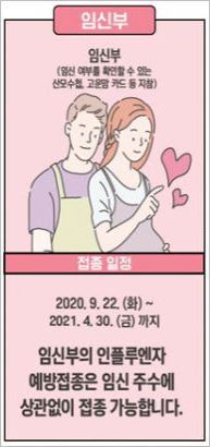 임신부는 9월22일부터 2021년 4월30일까지 가능하며, 이 역시도 기간의 제한없이 맞을 수 있습니다. 어르신 분들은 10월 13일부터 맞으실 수 있습니다.