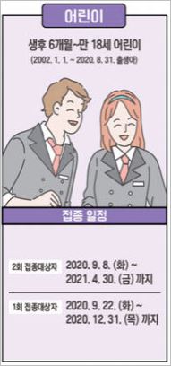 만 18세 이하의 어린이/청소년은 9월8일부터 2021년 4월30일까지 맞습니다. 사실상 이 연령대는 언제든 방문하여 맞을 수 있기 때문에 되도록 빨리 맞혀주는 것이 좋습니다.