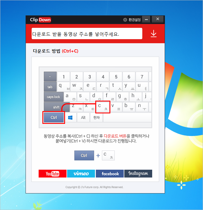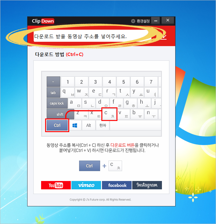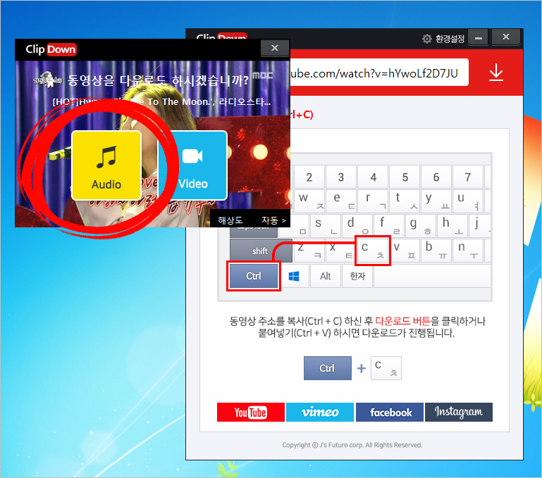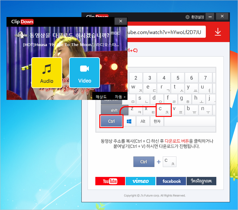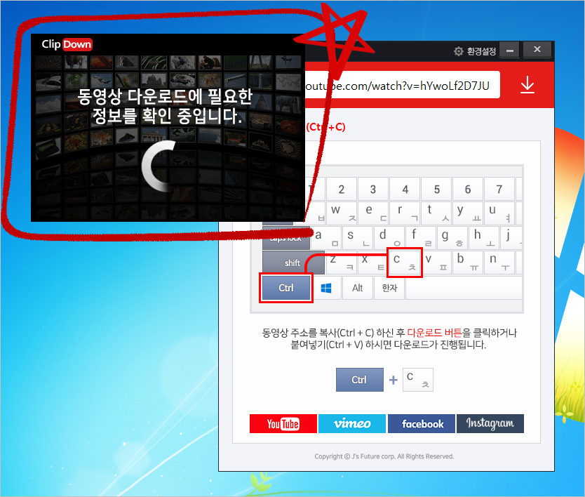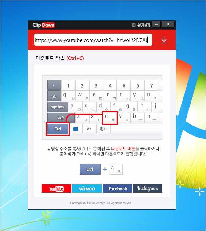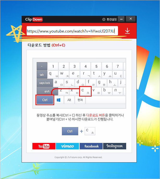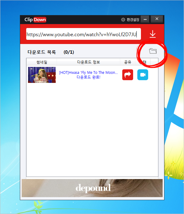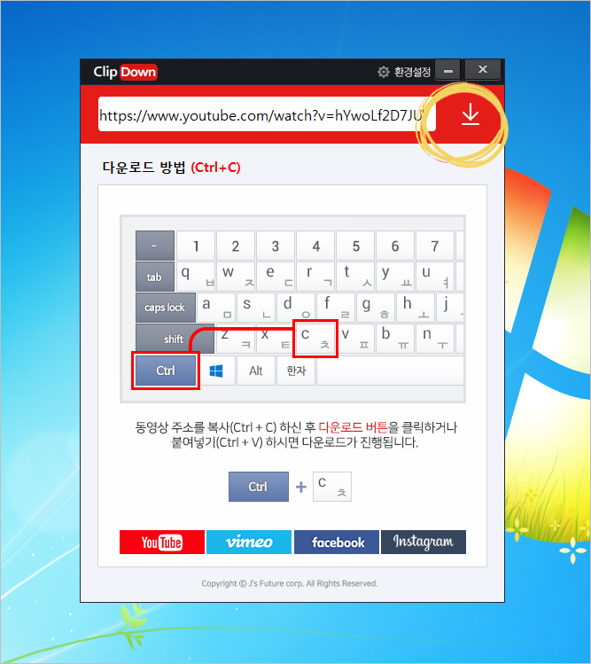 ⑤ 클립다운 프로그램의 주소창에 복사한 주소를 넣고 가장 우측에 있는 다운로드 아이콘을 선택하면 됩니다.