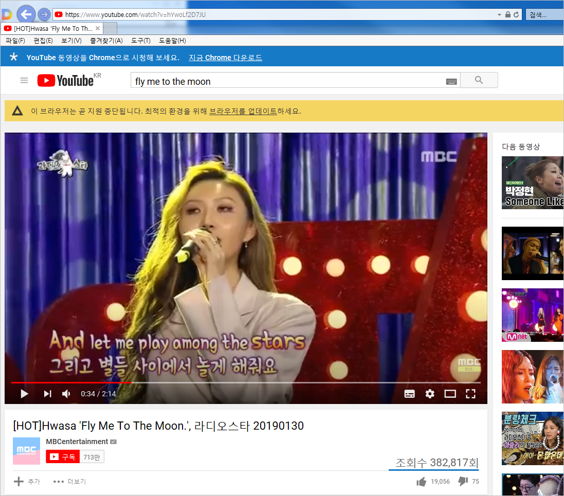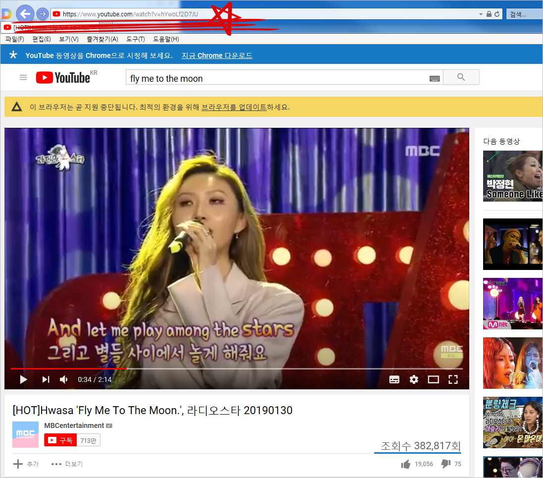 ④ 클립다운 프로그램은 열어놓은 상태에서 MP3로 변환하고 싶은 유튜브 영상을 찾습니다. 그 영상 상단에 있는 주소에서 Ctrl+C(복사)를 선택하면 됩니다. 저는 꿀보이스 화사의 'FLY ME TO THE MOON'을 다운받아보려 합니다.