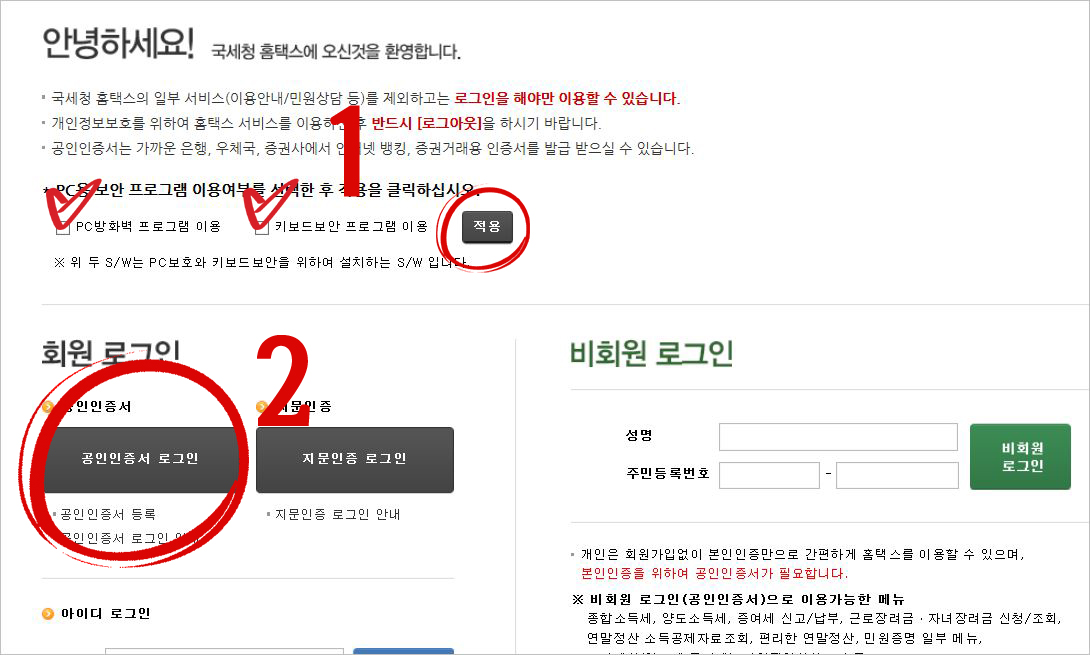 ⑤ 공인인증서를 통해 로그인하면 됩니다. 회사 또는 외부에서 로그인하는 것이라면 보안프로그램을 필히 설치 후 진행하셔야 합니다. *집에서는 체크하지 않아도 됩니다.