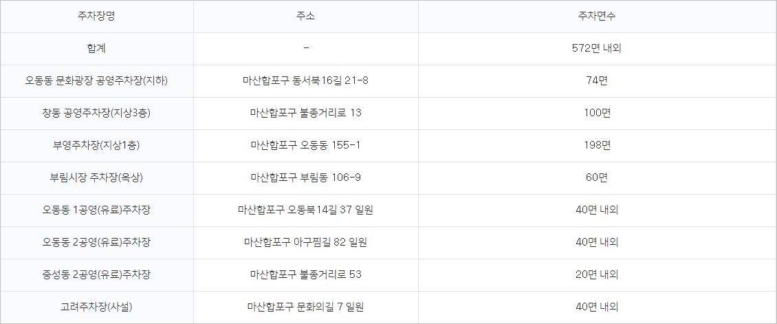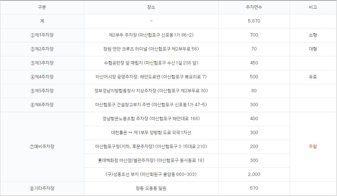 마산가고파수산시장 주변에는 총 8개의 주차장이 있으며, 이용시간은 오전 10시부터 오후 5시까지 입니다.