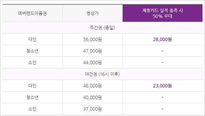 가격은 대인 기준으로 종일권 28,000원, 야간권(16시 이후) 23,000원 입니다. 대부분의 카드들이 할인적용을 받을 수 있으나 제휴카드 실적(보통 전월 30만원 이상)이 충족되어야 가능합니다. *실적은 카드별로 상이합니다.