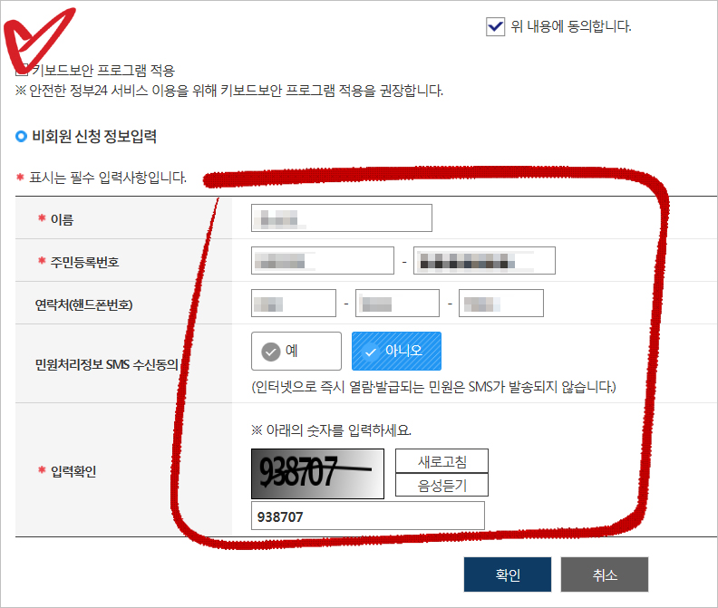 ④ [개인정보 수집 및 고유식별정보 수집 이용동의] 화면이 나오는데, 스크롤을 내려 동의합니다. 그 다음 개인정보를 모두 입력하고 확인을 선택하면 됩니다.