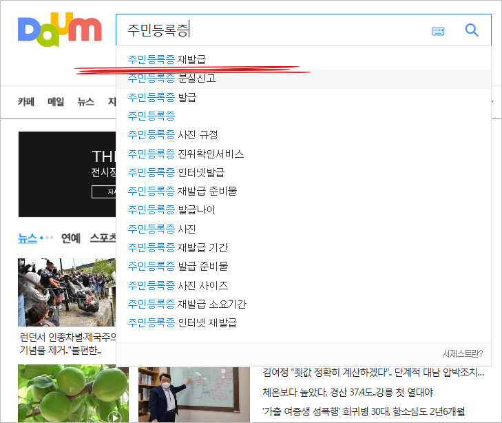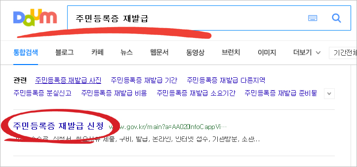 ① daum포털창에 [주민등록증 재발급]을 검색하여 나온 최상단 사이트에 들어갑니다.