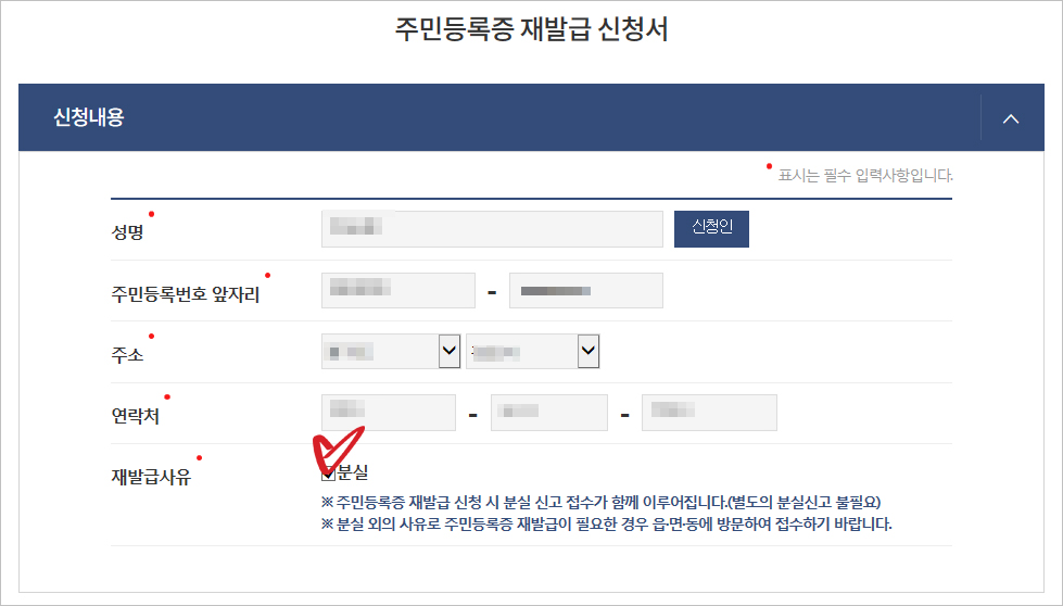 ⑥ 주민등록증 재발급 신청자의 개인정보를 정확하게 입력해 줍니다. 재발급사유는 [분실]에 체크하면 됩니다. 혹여 체크를 안하고 신청하면, 동사무소에서 전화가 올 수 있으며, 번거로운 절차가 생길 수 있습니다.