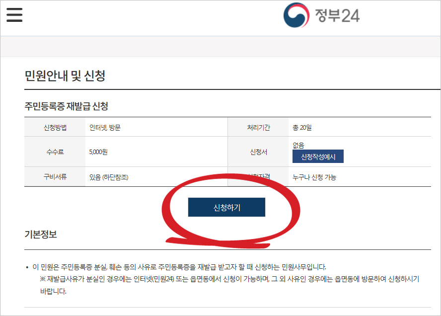 ② 주민등록증 재발급 신청 화면이 나오며, 하단에 [신청하기]를 선택합니다. 약 20일정도 걸리며 수수료는 5천원이 발생합니다. 주민등록증 재발급 비용 및 기간