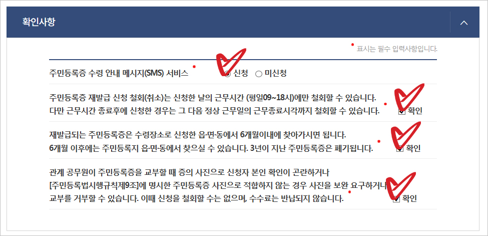⑦ 확인사항을 모두 체크하고, 파일첨부에 증명사진을 첨부하면 됩니다. 증명사진은 6개월 이내 촬영한 3.5cm X 4.5cm의 사진이어야 하며, 모자를 쓰면 안 됩니다. 혹여 이전 주민등록증 사진과 눈에 띠게 상이하다면 반려될 수 있습니다. 주민등록증 재발급 준비물
