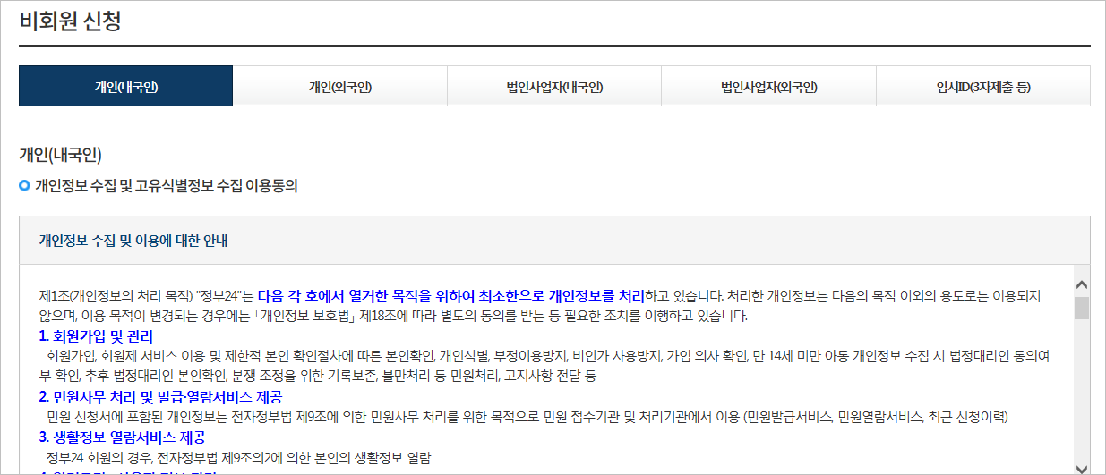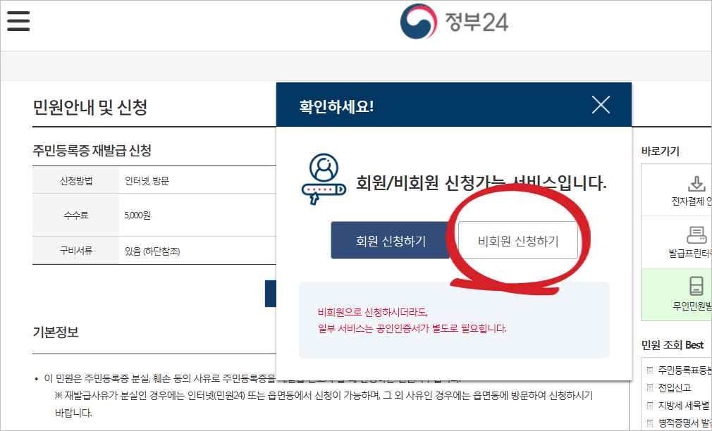③ 특별한 이유가 없다면 [비회원 신청하기]를 선택합니다. *회원신청하기는 발급 및 인쇄 내역이 남아 이전의 목록을 볼 수 있는 장점이 있습니다. 하지만 크게 사용할 일이 없으므로 비회원 신청하기를 추천드립니다.
