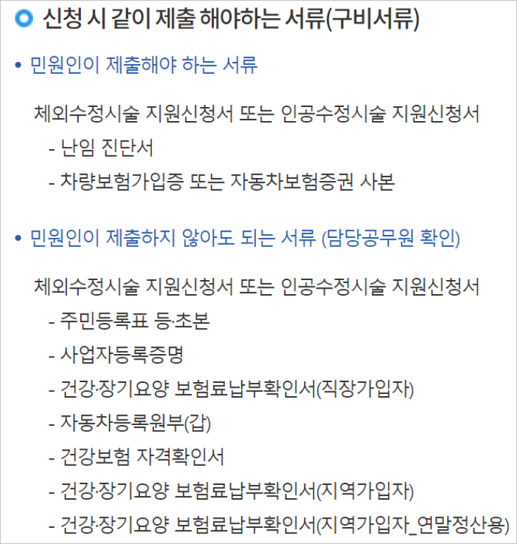 지원 자격은 그야말로 가장 기본에 해당되는 조건이므로, 이에 해당된다고 하여 시술비를 지원받을 수는 없습니다. 크게 2가지 조건에 해당되어야 받을 수 있는데요. 지금부터 알아보겠습니다.