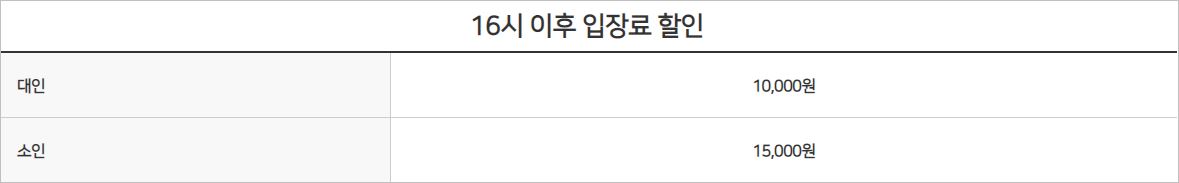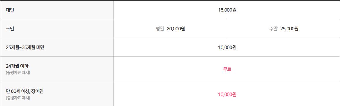 오후권(16시 이후)은 대인 10,000원 / 소인 15,000원에 이용이 가능합니다. 24개월 이하는 증빙서류만 있으면, 무료로 모두 이용하실 수 있습니다.