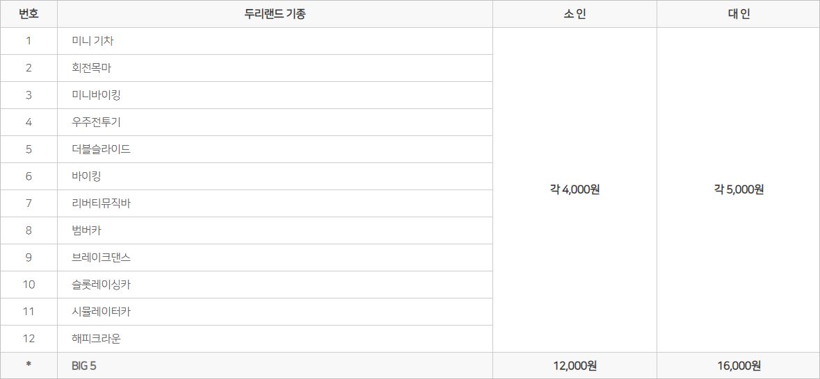 두리랜드의 놀이기구는 총 12가지로 가격은 각각 소인 4천원 / 대인 5천원의 금액을 받고 있습니다. 5개를 묶은 'BIG5'로 할인을 받을 수도 있으니 참고해주세요.