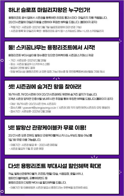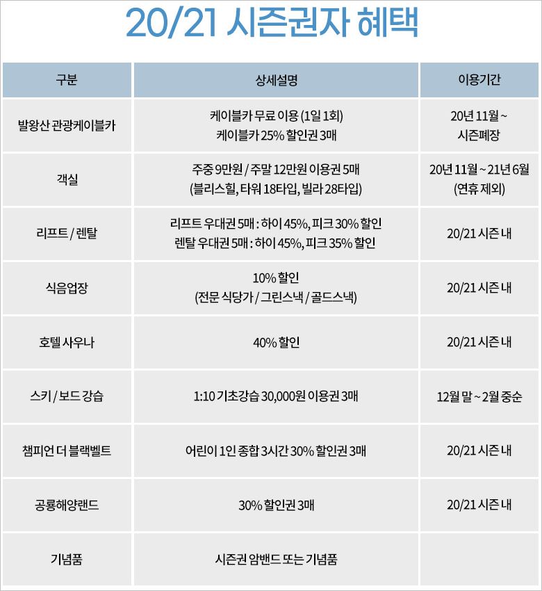 용평리조트는 시즌권자에게 혜택이 많기로도 유명합니다. 발왕산 관광케이블카 무료 이용 및 객실권, 호텔사우나, 공룡해양랜드 등의 할인혜택도 주어집니다.