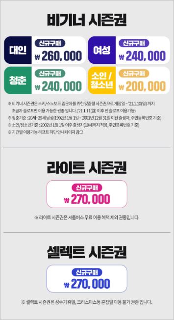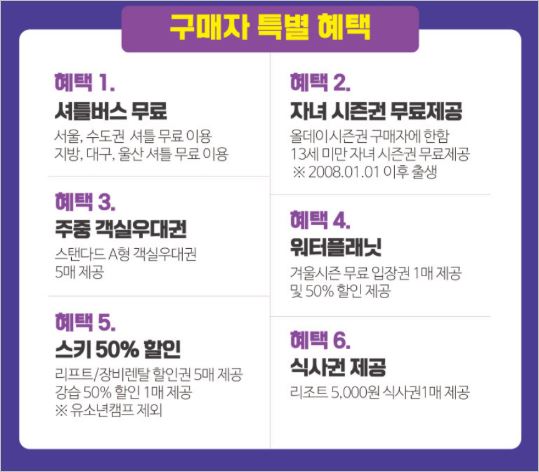 '라이트시즌권'은 셔틀버스를 이용할 수 없으며, '셀렉트시즌권'은 주말, 크리스마스 등에 사용할 수 없는 단점이 있습니다. 객실우대권 및 렌탈할인, 식사권 등 다양한 혜택이 주어집니다.
