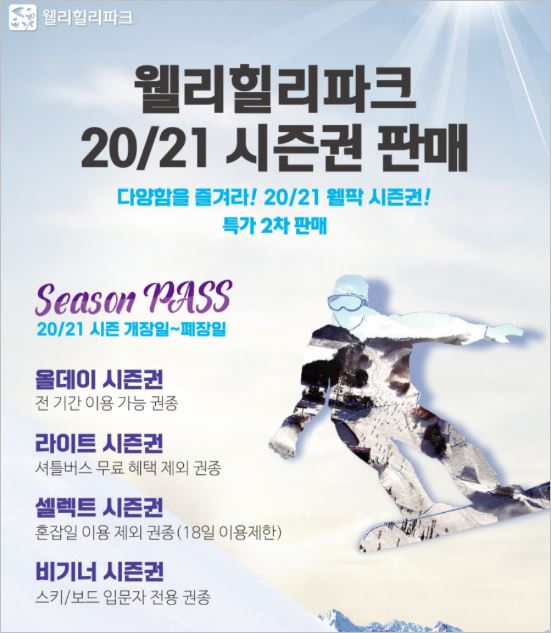 웰리힐리파크는 시즌권을 4종으로 발매, 각각 라이프스타일에 맞게 합리적으로 구매할 수 있는 특징이 있습니다. 판매기간은 10.06일부터 11월19일까지로 G마켓, 위메프, 인터파크 등에서 구매가 가능합니다.