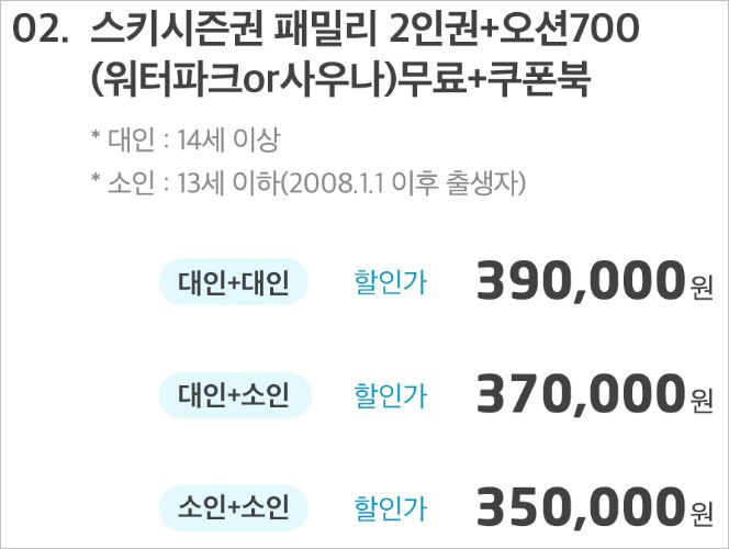 오크밸리 스키장은 10월31일까지 시즌권을 판매하고 있습니다. 오크밸리는 현재 1+1이벤트를 진행 중에 있어 대인 1명이 전일 시즌권을 끊으면, 소인 한명은 무료로 시즌권을 주고 있습니다. *가족관계증명서 지참