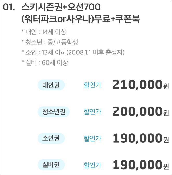 1인 대인 기준 시즌권+오션700 패키지가 21만원이고, 커플 2인권은 39만원입니다. 위메프, 티몬 등에서 구매가 가능하니 참고바랍니다.