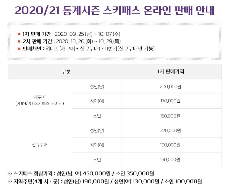 하이원리조트 스키장은 시즌권 1차 판매는 마감했고, 2차 판매가 10월 20일부터 10월 29일까지 있습니다. 위메프와 11번가를 통해 구매가 가능하며 신규 구매시 성인 남성 22만원, 여성 19만원 입니다. *정상가는 45만원 입니다.