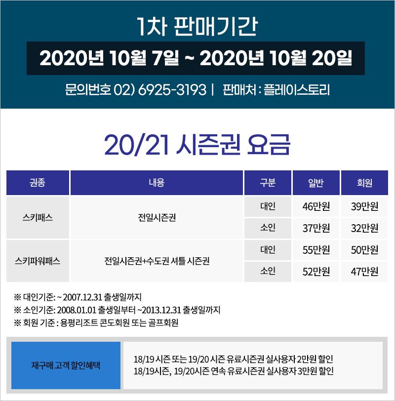 용평리조트는 10.07일부터 10.20일까지 1차 시즌권을 판매하고 있습니다. 일반 대인 기준 전일 시즌권은 46만원, 수도권 셔틀버스까지 함께 패키지(스키파워패스)로 끊으면 55만원입니다. *시즌권 재구매자 2~3만원 추가 할인