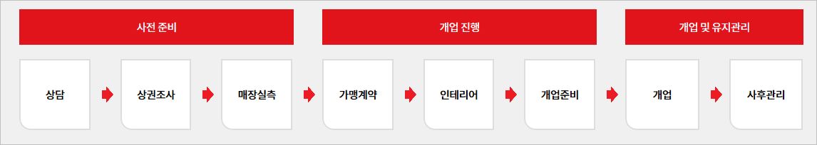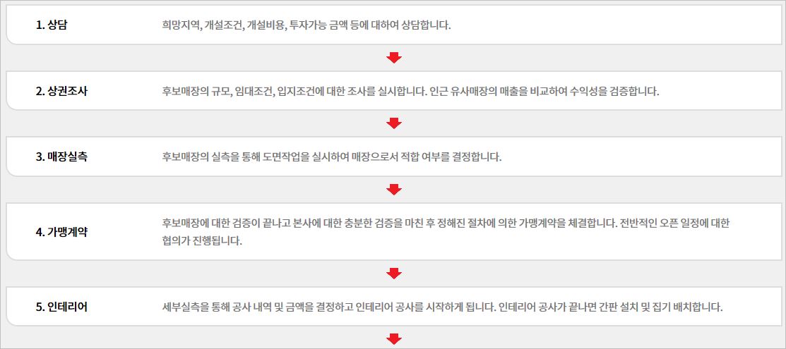 다이소 가맹점을 내기 위해서는 총 8단계의 절차를 거치게 됩니다. 상담을 통해 점주 자격요건이 된다면 상권을 정하고 인테리어를 시작하게 됩니다. 오픈까지의 일련과정들은 다이소에서 전부 맡아서 해주게 됩니다.