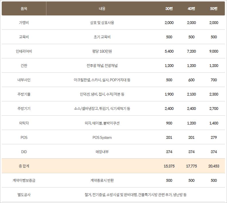 이는 보증금 및 권리금을 제외한 금액이며, 30평 기준 1억5천만원 정도가 들어간다고 볼 수 있습니다. 매장 상황에 따라 별도공사가 이뤄질 경우 추가금이 생길 수도 있으니 참고하시면 될 것 같습니다.