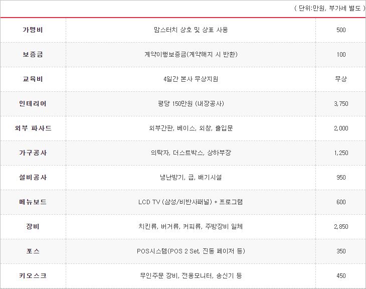 맥도날드, 버거킹과 같은 햄버거 프랜차이즈와 비교했을 때는 저렴한 비용에 속하며, 교육비가 무상으로 제공되는 부분이 장점이라 할 수 있습니다.