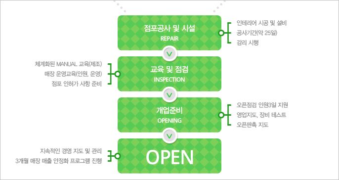 ★ 점포 소유 시 : 입지조사 > 타당성 검토 > 가맹계약 > 점포공사 > 교육 > 개업 / ★ 점포 미소유 시 : 입지 선정 > 점포 선정 > 점포 계약 > 점포공사 > 교육 > 개업