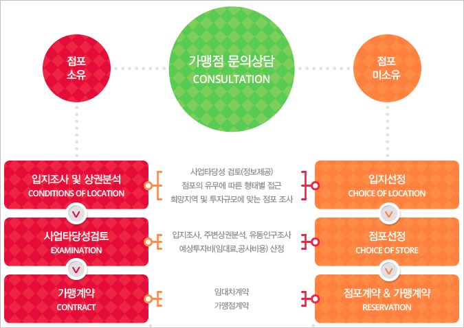 가맹점 개설절차는 점포를 소유하고 있느냐, 소유하지 않았느냐에 따라 달라지게 됩니다. 즉, 점포를 소유했을 시에는 입지타당성 체킹을 먼저하게 되고, 미소유시에는 적정 입지를 찾는 과정이 먼저 이루어지게 됩니다.