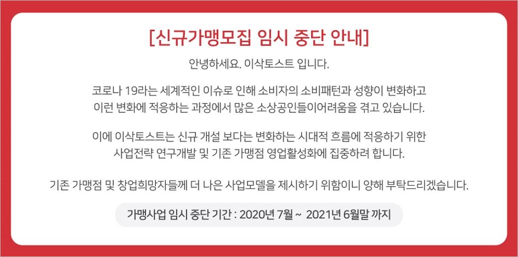 하지만 현재 이삭토스트는 신규가맹모집을 임시 중단한 상태입니다.