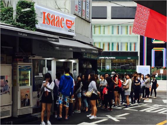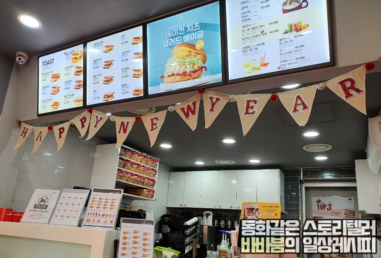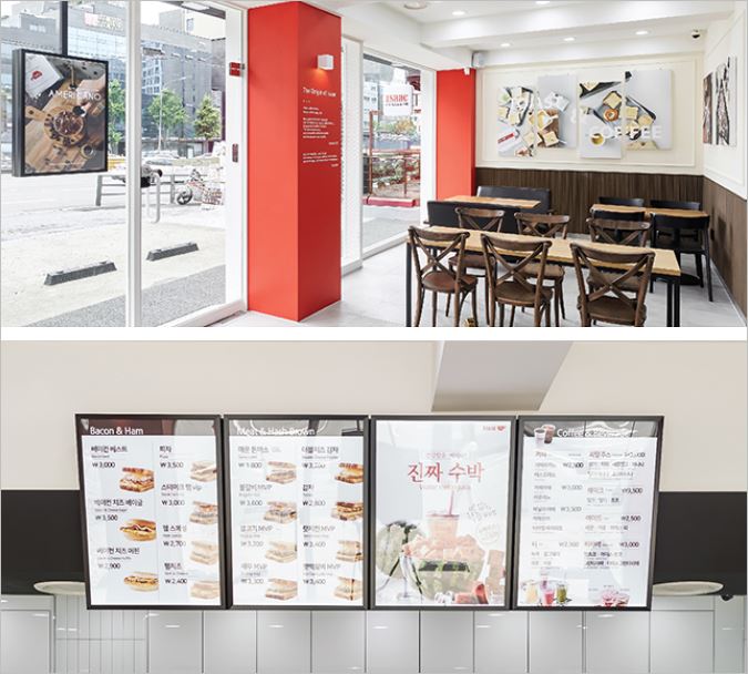 이삭토스트는 흰색에 빨간색으로 포인트를 주는 깔끔한 인/아웃테리어를 연출하고 있습니다. 마치 작은 미술관 같은 느낌을 받기도 하는데요. 현란한 조명과 색을 쓰는 프랜차이즈들 사이에서 오히려 눈에 잘 띄고, 여유로움마저 느껴집니다.