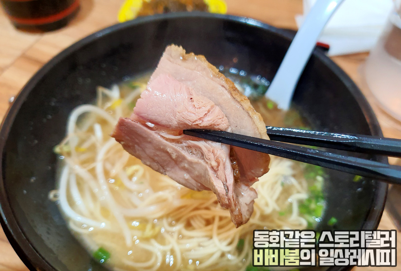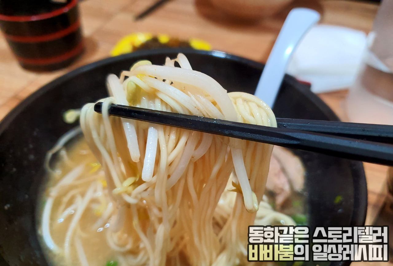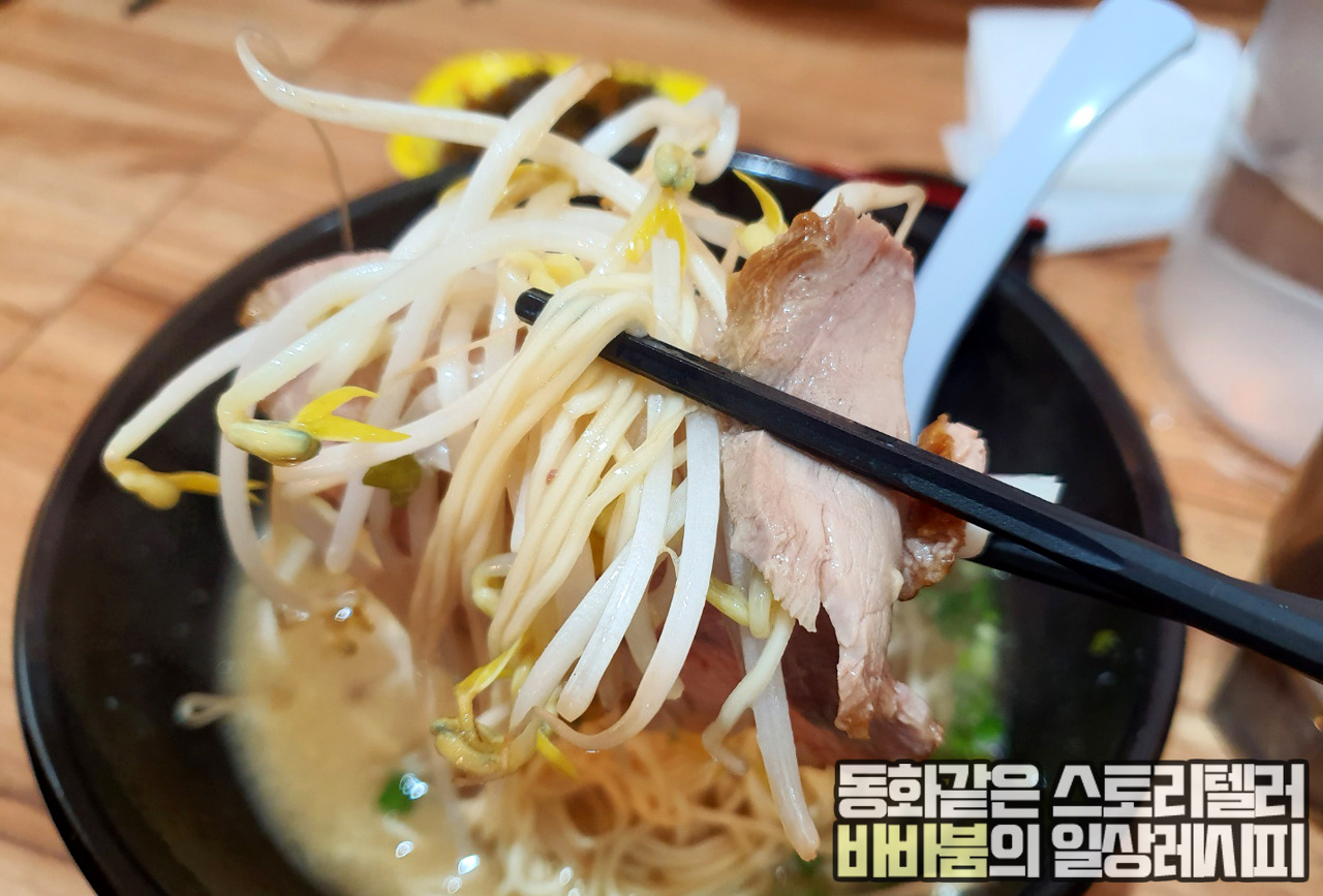 우선 라멘 국물이 정말 이보다 깊을 수가 있나 싶을 정도로 푹 끓인 느낌이 납니다. 굉장히 진하면서 돼지기름의 윤기가 나서 정말 먹음직스럽습니다. 맛도 맛이지만 면과 고기의 식감 또한 일품입니다.
