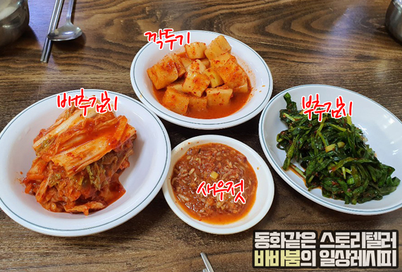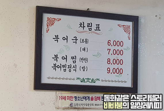 가격은 북어국 보통 6천원 / 대 7천원으로 굉장히 저렴한 편입니다. 보통 사이즈도 굉장히 크게 나오기 때문에 식사량이 많으신 분만 '대'자리를 시켜야 합니다. 밑반찬으로 나오는 김치들이 정말 일품이구요.